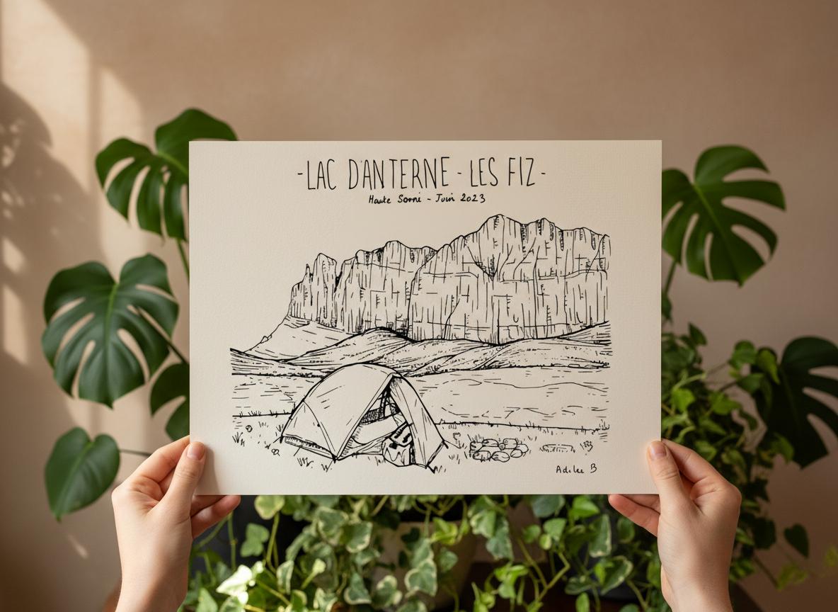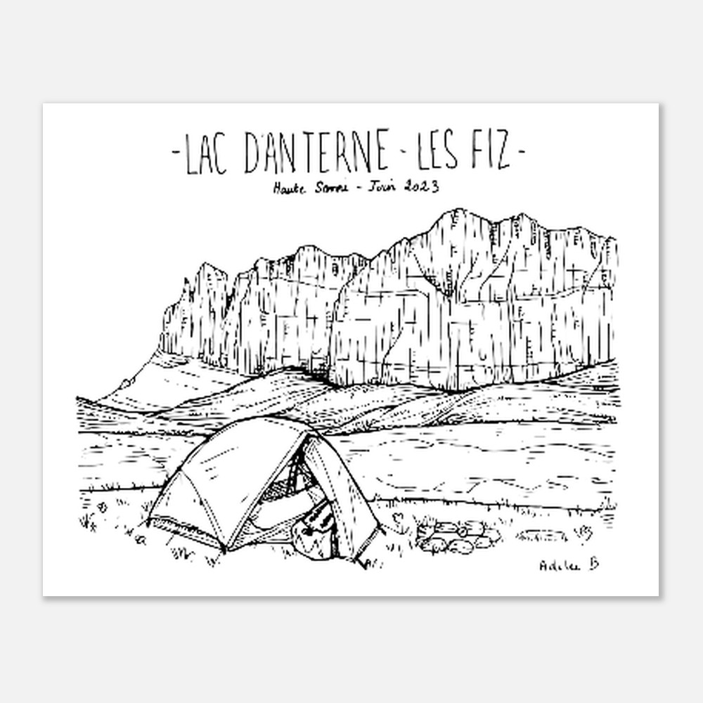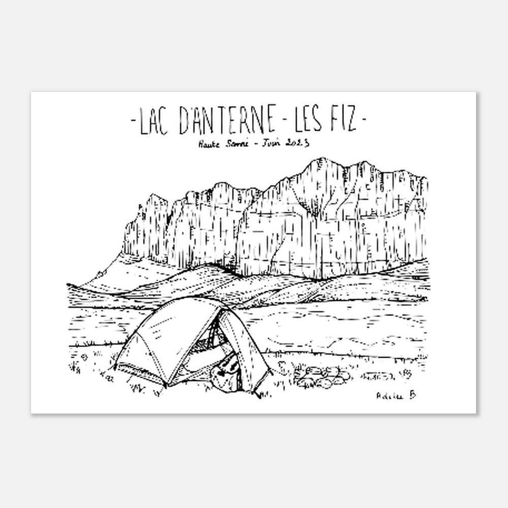 Ce dessin au trait fin capture toute la beauté du Lac d’Anterne à Passy et les parois abruptes du massif des Fiz. Il a été réalisé directement depuis les sentiers pendant un tour des Fiz.